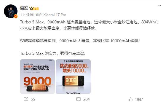 小米创办人雷军1月19日深夜发文称,Turbo 5 Max,9000mAh 超大容量电池,迄今最大小米金沙江电池。894Wh/L 小米史上最大能量密度,让高性能尽情释放。权威媒体续航榜实测,9000mAh大电量,实现比肩 10000mAh续航!Turbo 5 Max 的实力,强得有点离谱。