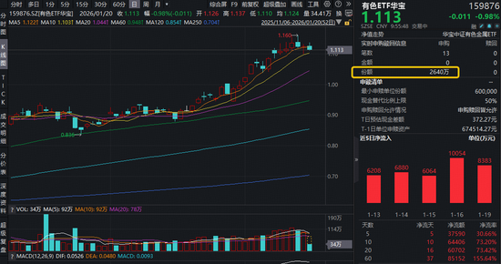 今日(1月20日)有色ETF华宝(159876)开盘活跃,场内价格一度涨超1%,后随市盘整回调,场内价格现跌0.98%,资金或迎逢跌布局时刻,截至发稿,该ETF获资金净申购2640万份,此前10日连续狂揽6.44亿元!